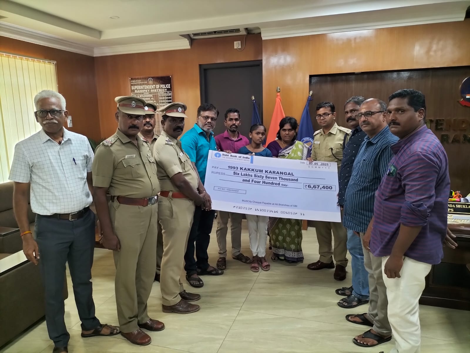 இராணிப்பேட்டை மாவட்டம் வாழைப்பந்தல் காவல் நிலையத்தில் பணியாற்றி வந்த .பலராமன் என்பவர் கடந்த 24.12.2024 தேதி வாகன விபத்தில் இறந்தார். இவர்களின் குடும்பத்திற்கு தனிப்பட்ட முறையில் தங்களால் இயன்ற உதவி செய்ய வேண்டும் என்ற கருணை உள்ளத்தோடு அவருடன் 1993 ஆம் ஆண்டு காவலர் பணியில் சேர்ந்த தமிழக முழுவதும் உள்ள சக காவலர்கள் ஒன்று திரண்டு ரூபாய் 6,67,400/- பணத்தை நன்கொடையாக பெற்று (03.05.2025) அன்று இராணிப்பேட்டை மாவட்ட காவல் அலுவலகத்தில் 1993 ஆம் ஆண்டு காவலர்கள்முன்னிலையில்மாவட்டகாவல்கண்காணிப்பாளர்.விவேகானந்தசுக்லா,அவர்களது குடும்பத்தினருக்கு வழங்கி ஆறுதல் கூறினார். அப்போது மாவட்ட காவல்கண்காணிப்பாளர் அவர்கள் ஒற்றுமை உணர்வுடன் கருணை உள்ளத்தோடு மேற்படி நிதியை வழங்கிய 1993 ஆம் ஆண்டு காவலர்களுக்கு பாராட்டுகளை தெரிவித்தார். இந்நிகழ்வில் 1993 ஆம் ஆண்டு காவலர்கள் பலர் கலந்து கொண்டனர்