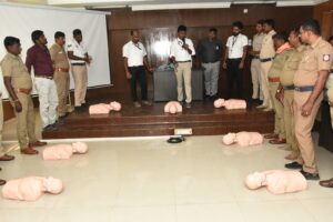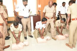 ❇️ இராணிப்பேட்டை மாவட்ட காவல்துறையினர், விபத்து மற்றும் மாரடைப்பு போன்ற ஆபத்தான சூழ்நிலைகளில் பொதுமக்களுக்கு எவ்வாறு முதலுதவி வழங்க வேண்டும் என்பது தொடர்பாக காவல்துறையினருக்கு பயிற்சி அளிக்கும் வகையில், மாவட்ட காவல் கண்காணிப்பாளர் *திருமதி அய்மன் ஜமால், இ.கா.ப.,* அவர்களின் உத்தரவின்படி இன்று Scudder Memorial Hospital சார்பில் டாக்டர் இம்மானுவேல் சதீஷ் அவர்களின் தலைமையில் மருத்துவ நிபுணர்களால் காவல்துறையினருக்குமாவட்ட காவல் அலுவலகத்தில் பொம்மை மனித உடல் மற்றும் மின்திரை மூலம் செயல்முறை விளக்கத்துடன் பயிற்சி வழங்கப்பட்டது. ❇️ இந்த முதலுதவி பயிற்சி வகுப்பில் விபத்தில் காயம் அடைந்தவர்களுக்கு உதவி செய்வதன் முக்கியத்துவம் குறித்தும், எவ்வாறு முதலுதவி செய்ய வேண்டும் என்பது குறித்தும் எடுத்துரைக்கப்பட்டது. விபத்து நடந்த நிமிடத்தில் இருந்து,பாதிக்கப்ட்டவர்களை மருத்துவமனையில் சேர்க்கும் வரை உள்ள நேரம் மிகவும் பொன்னானது. ஆகவே அவர்களை எவ்வளவு விரைவாக மருத்துவமனையில் அனுமதிக்க இயலுமோ அந்த அளவு வெகு விரைவாக மருத்துவமனையில் அனுமதித்து அவர்களது உயிரை காப்பாற்ற வேண்டும் என்பது உட்பட பல்வேறுமுதலுதவிபயிற்சிகள்குறித்துஎடுத்துரைத்தனர்.