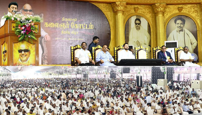 எந்த சம்பவம் நடந்தாலும் – தலைவர் இருந்தால் என்ன முடிவெடுப்பார் என்று யோசித்து அந்த முடிவையே நான் எடுக்கிறேன். அதனால்தான் சரியான திசையில் சென்று கொண்டிருக்கிறேன். ‘எனது உயரம் எனக்குத் தெரியும்’ என்று சொல்லிக் கொண்டாரே தவிர – இந்தியாவின் ஜனநாயகம் எப்போதெல்லாம் நெருக்கடிக்கு உள்ளாகியதோ அப்போதெல்லாம் இந்தியத் தலைவராக தனது எல்லையை விரித்தவர்தான் நம்முடைய தலைவர் கலைஞர். கலைஞர் கோட்டத்தை திறந்து வைப்பதற்காக பீகார் மாநிலத்தின் முதலமைச்சர் மாண்புமிகு நிதிஷ்குமார் அவர்கள் வருவதாக இருந்தது.ஆனால், அவருக்கு திடீரென உடல் நலக்குறைவு ஏற்பட்ட காரணத்தால், வர இயலவில்லை. எனவே, இன்று காலையில் என்னை தொலைபேசி வாயிலாகத் தொடர்புகொண்டு, இந்த வரலாற்று சிறப்புமிக்க நிகழ்ச்சிக்கு வரமுடியாமல் போனது குறித்து வருத்தம் தெரிவித்தார். ஆனாலும், அவர் இன்று நிகழ்த்துவதாக இருந்த உரையை, தமிழாக்கம் செய்து நம்முடைய திருச்சி சிவா அவர்கள் இங்கே வாசித்தார்கள். அந்த உரை மிகச்சிறப்பாக அமைந்திருந்தது. பீகார் மாநில துணை முதலமைச்சர் தேஜஸ்வீ வந்திருக்கிறார். அவருக்கு இந்த நேரத்திலே என்னுடைய மனமார்ந்த நன்றியை நான் தெரிவித்துக் கொள்ள விரும்புகிறேன். ஆகஸ்ட் 15 – விடுதலை நாள் அன்று மாநில முதலமைச்சர்கள் எல்லாம் கொடி ஏற்ற வேண்டும் என்று இந்தியாவின் அனைத்து மாநில முதலமைச்சர்களுக்கும் உரிமையைப் பெற்றுத் தந்தவர் கலைஞர். அதேபோல் இந்திய அரசியலில் 1971 முதல் அனைத்து அரசியல் பெரு மாற்றங்களுக்கும் முக்கிய காரணமாக இருந்தவர் தலைவர் கலைஞர்.* இந்திரா காந்தி அம்மையார் தொடங்கி அத்தனை இந்தியப் பிரதமர்களுடனும் நல்லுறவை வைத்திருந்தவர் நம்முடைய தலைவர் கலைஞர் அவர்கள். ஆட்சி மாற்றத்துக்கும் – பிரதமர்களை உருவாக்குவதிலும் கலைஞரின் பங்கு பெரும் பங்காக இருந்துள்ளது.* சஞ்சீவி ரெட்டி முதல் பிரதீபா பாட்டீல் வரை எல்லா குடியரசுத் தலைவர்களுடனும் நட்பு வைத்திருந்தவர் நம்முடைய முத்தமிழறிஞர் தலைவர் கலைஞர் அவர்கள். அவரால் உருவாக்கப்பட்ட குடியரசுத் தலைவர்கள் அதிகம்.கலைஞர் குடியிருந்த கோபாலபுரம் இல்லத்துக்கு பிரதமர்களும், அகில இந்திய அரசியல் தலைவர்களும், பிற மாநில முதலமைச்சர்களும் அதிகமாக வந்திருக்கிறார்கள். அந்த வகையில் இந்திய அரசியலில் மாபெரும் அரசியல் ஆளுமையாக இருந்தவர் நம்முடைய தலைவர் கலைஞர். அதனால்தான் அவரது புகழைப் போற்றுவதற்காக பீகாரில் இருந்து தேஜஸ்வீ அவர்கள் வருகை தந்திருக்கிறார்கள். இந்தியாவில் ஜனநாயகத்தை காக்கக்கூடிய பொறுப்பை ஏற்று அதற்கு அடித்தளம் அமைக்கும் பணியை பீகார் தொடங்கியிருக்கிறது. வருகிற 23-ஆம் தேதியன்று பீகார் மாநிலம்