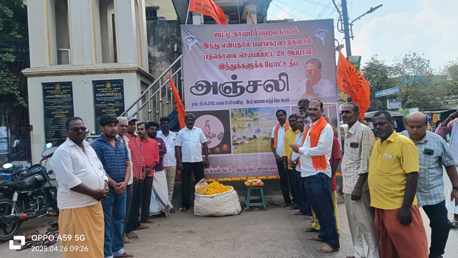 .காஷ்மீரில். தீவிரவாதிகளால்பலியான ஹிந்துகளுக்கு. மலர் அஞ்சலி மோட்ச தீபம் ஏற்றப்பட்டது இந்து மக்கள் கட்சியின் சார்பாக. வாலாஜா பேருந்து நிலையம் அருகாமையில் காந்தி சிலை அருகில். வேலூர் கோட்ட தலைவர் எஸ் கே மோகன் தலைமை.கலந்து கொண்ட கட்சி நிர்வாகிகள் சமூக ஆர்வலர்கள்.. சமூக ஊடக பிரிவுமாநிலதலைவர்ஜெகண்ணன்மீனவர்அணிமாநிலதலைவர்ஜெயக்குமார்