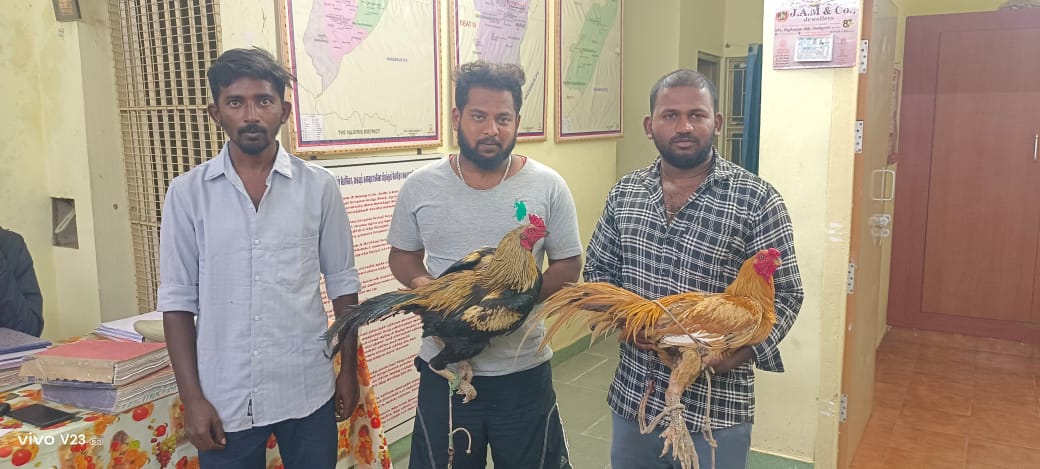 ஈரோடு மாவட்டம் சத்தியமங்கலம் அடுத்த தாளவாடி அடுத்த திகனாரை கிராமத்தில் சேவல் சூதாட்டம் நடப்பதாக தாளவாடி போலீசாருக்கு தகவல் கிடைத்தது. சம்பவ இடத்திற்கு சென்ற தாளவாடி போலீசார் அங்கு ஆய்வு செய்தனர். அப்பொழுது அங்கு 3 பேர் சேவல் வைத்து சூதாட்டம் நடத்திக் கொண்டிருந்தனர். விசாரணையில் சிவக்குமார், ரகு, குணசேகரன் என்பது தெரியவந்தது. அவர்களிடமிருந்து இரண்டு சேவலை பறிமுதல் செய்து 3 பேரை கைது செய்தனர். மாவட்ட நிருபர் SKT சுரேஷ்குமார்
