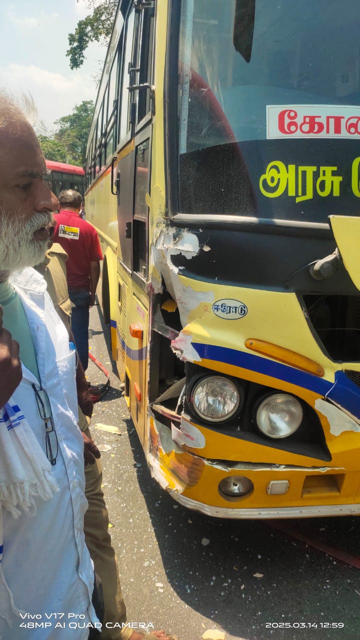 ஈரோடு மாவட்டம் கோவையிலிருந்து கர்நாடக மாநிலம் மைசூருக்கு, தமிழக அரசு பஸ், 80 பயணி களுடன் நேற்று புறப்பட்டது. சத்தியமங்கலத்தை அடுத்த திம்பம் மலைப்பாதை வழி யாக, 2:00 மணிக்கு சென்றது. அதேசமயம் எதிரே மைசூருவில் இருந்து திண்டுக்கல் லுக்கு, கர்நாடகா மாநிலஅரசு பஸ், 80 பயணிகளுடன் வந்தது. மலைப்பாதையின், 23வது கொண்டை ஊசி வளைவில் எதிரெதிரேவந்தபோது எதிர்பாராதவிதமாக பக்கவாட்டில் இரு பஸ்களும் மோதிக்கொண்டன. இதில் பயணிகள் காயம் அடையவில்லை. அதேசமயம் மலைப் பாதையில், 45 நிமிடம்போக்குவரத்து பாதிக்கப்பட்டது. மாவட்ட நிருபர் சுரேஷ்குமார்