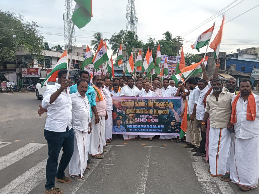 திருவாரூர் மாவட்டம் நீடாமங்கலம் பகுதியில் 28.05.2025 மாலை திருவாரூர் பாரதிய ஜனதா கட்சி சார்பில் சிந்தூர் ஆப்ரேஷன் வெற்றியை கொண்டாடும் வகையில் இந்தியாவின் முவர்ண கொடி ஏந்தி பேரணி திருவாரூர் மாவட்ட துணை தலைவர் ஜெயக்குமார் தலைமையில் பேரணி சிறப்பாக நடைபெற்றது ஒன்றிய தலைவர் பிரபாகரன் வர்த்தக பிரிவு பிரபு விவசாய பிரிவு சரவணன் நகரத்தலைவர் சிந்து சுப்ரமணியம் மற்றும் ஏராளமான பாரதிய ஜனதா கட்சியின் தொண்டர்கள் கலந்து கொண்டனர்