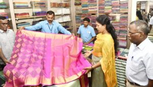தேனிமாவட்டம் தேனி-அல்லிநகரம் நகராட்சிக்குட்பட்ட கோ-ஆப்டெக்ஸ் விற்பனை நிலையத்தில் தீபாவளி பண்டிகை சிறப்பு தள்ளுபடி விற்பனையினை மாவட்ட ஆட்சித்தலைவர். ஆர். வி. ஷஜீவனா. இ. ஆ. ப. அவர்கள் துவக்கி வைத்து கைத்தறி ஆடைகளை பார்வையிட்டார்.