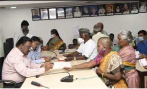 தேனி மாவட்ட ஆட்சியர் அலுவலகத்தில் 16. 05 .2022 நடைபெற்ற மக்கள் குறைதீர்க்கும் நாள் கூட்டத்தில் மாவட்ட ஆட்சித்தலைவர் திரு.க.வீ முரளிதரன் இ.ஆ.ப . அவர்கள்பொதுமக்களிடமிருந்து மனுக்களை பெற்று குறைகளை ‘கேட்டறிந்தார் உடன் மாவட்ட வருவாய் அலுவலர் தி. சுப்பிரமணியன் இருந்தார்
