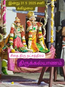 திருவாரூர் மாவட்டம் நீடாமங்கலம் குழந்தை வரம் அருளும் ஶ்ரீ சந்தான ராமர் கோவிலில் 30.05.2025 காலை சந்தான ராமர் சீதா லெட்சுமணர் ஆஞ்சநேயர் ஆழ்வார்கள் ஸ்வாமிகளுக்கு சிறப்பு திருமஞ்சனம் நடைப்பெற்றது மாலை ராமர் சீதா திரு கல்யாணம் சிறப்பாக நடைபெற்றது அன்னதானம் வழங்கப்பட்டது சந்தான ராமர் சேவா ட்ரஸ்ட் நிர்வாகி சந்தானம் ஸ்வாமிகள் மற்றும் சந்தான ராமர் சேவா ட்ரஸ்ட் நிர்வாகிகள் செயல் அலுவலர் ஆய்வாளர் உபயதாரர்கள் கணக்காளர் மற்றும் ஏராளமான பக்தர்கள் கலந்து கொண்டனர்.