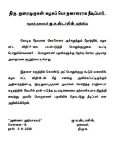இதற்கிடையே திமுகவின் பொருளாளர் துரைமுருகன் தனது பதவியை ராஜினாமா செய்தார். அதன் பிறகு, கொரொனா ஊரடங்கு அறிவிக்கப்பட திமுகவின் பொதுக்குழு கூட்டம் ரத்தானது.
