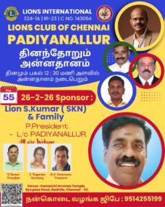 நாளைய தினம் 55 வது நாள் நித்திய அன்னதானம் நமது பாடியநல்லூர் லயன்ஸ் சங்க முன்னாள் தலைவர் லயன் குமார் எஸ் கே என் அவர்கள் குடும்பத்தினர் சார்பாக சிறப்பாக நடைபெற உள்ளது.நமது சங்க குடும்ப நண்பர்கள் அனைவரும் வருகை தந்து அன்னதான நிகழ்வை சிறப்புடன் நடத்தித் தர அன்புடன் அழைக்கின்றேன்.அட்மின்சண்முகசுந்தரம்