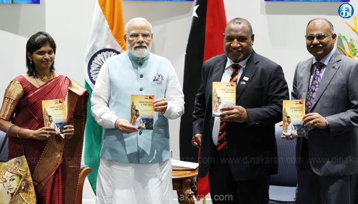 பிரதமர் மோடி ஜப்பான், ஆஸ்திரேலியா ஆகிய நாடுகளுக்கு கடந்த 19-ந் தேதி சுற்றுப்பயணத்தை தொடங்கினார். அன்றைய தினம், ஜப்பான் நாட்டின் ஹிரோஷிமா நகருக்கு சென்றார். அங்கு நடைபெற்ற ஜி-7 உச்சி மாநாட்டில் கலந்து கொண்டார். இங்கிலாந்து பிரதமர் ரிஷி சுனக், பிரேசில் அதிபர் லுலா டா சில்வா உள்ளிட்டோரை சந்தித்து பேசினார்.  ஜப்பான் பயணத்தை முடித்துக்கொண்டு, பிரதமர் மோடி நேற்று முன்தினம் இரவு, பசிபிக் தீவு நாடான பப்புவா நியூகினியா சென்றார். இந்திய பிரதமர் ஒருவர் அந்நாட்டுக்கு செல்வது இதுவே முதல்முறை ஆகும்.  தலைநகர் மோர்ஸ்பி விமான நிலையத்தில் மோடிக்கு சிவப்பு கம்பள வரவேற்பு அளிக்கப்பட்டது. அந்நாட்டு பிரதமர் ஜேம்ஸ் மரப், மோடியின் பாதங்களை தொட்டு வணங்கினார். திருக்குறள்  இந்நிலையில், நேற்று மோர்ஸ்பி நகரில் நடந்த நிகழ்ச்சியில், பப்புவா நியூகினியா நாட்டின் அலுவல் மொழியான டோக் பிசின் மொழியில்பிரதமர் மோடிக்கு பப்புவா நியூகினியா, பிஜி தீவின் உயரிய விருதுகள் மொழிபெயர்க்கப்பட்ட ‘திருக்குறள்’ நூலை பிரதமர் மோடியும், பப்புவா நியூகினியா பிரதமர் ஜேம்ஸ் மரப்பும் கூட்டாக வெளியிட்டனர். இந்த நூலை தமிழர்களான வெஸ்ட் நியூ பிரிட்டன் மாகாண கவர்னர் சசிந்திரனும், அவருடைய மனைவி சுபா சசிந்திரனும் மொழிபெயர்த்துள்ளனர். அவர்களுக்கு பிரதமர் மோடி பாராட்டு தெரிவித்துள்ளார். அவர் தனது ‘டுவிட்டர்’ பக்கத்தில் கூறியிருப்பதாவது:- பப்புவா நியூகினியாவில், பிரதமர் ஜேம்ஸ் மரப்பும், நானும் திருக்குறள் நூலை வெளியிடும் கவுரவத்தை பெற்றோம். திருக்குறள், அடையாள சின்னமான படைப்பு. வெவ்வேறு துறைகள் பற்றிய ஆழ்ந்த சிந்தனைகளை அப்புத்தகம் வெளிப்படுத்துகிறது. கவர்னர் சசிந்திரனும், சுபா சசிந்திரனும் இதை டோக் பிசின் மொழியில் மொழிபெயர்க்க எடுத்துக்கொண்ட முயற்சிகளை பாராட்டுகிறேன். சசிந்திரன், பள்ளிப்படிப்பை தமிழில் படித்தவர். சுபா சசிந்திரன், ஒரு மொழியியல் வல்லுனர் என்று அவர் கூறியுள்ளார். பிஜி தீவு விருது மோர்ஸ்பி நகரில் நடந்த நிகழ்ச்சியில், பிஜி தீவின் உயரிய விருதான ‘கம்பேனியன் ஆப் தி ஆர்டர் ஆப் பிஜி’ என்ற விருதை பிரதமர் மோடிக்கு பிஜி பிரதமர் சிதிவேனி ரபுகா வழங்கினார். அதை பெற்றுக்கொண்ட பிரதமர் மோடி, இந்திய மக்களுக்கும், இந்தியா-பிஜி தீவு இடையிலான விசேஷ உறவுக்கு முக்கிய பங்கு வகித்த பிஜி தீவுவாழ் இந்தியர்களுக்கும் அர்ப்பணிப்பதாக அறிவித்தார். மேலும், அவர் தனது ‘டுவிட்டர்’ பக்கத்தில், ”இவ்விருது, இந்தியாவுக்கு கிடைத்த கவுரவம். இந்தியா-பிஜி தீவு இடையிலான வலிமையான உறவுக்கு அங்கீகாரம்” என்று கூறியுள்ளார். பப்புவா நியூகினியா விருது அதைத்தொடர்ந்த