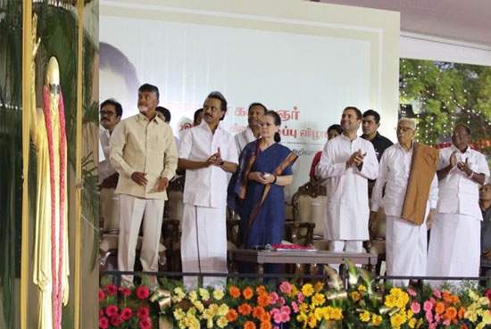 மறைந்த முன்னாள் முதல்வர் கருணாநிதியின் சிலை சோனியா காந்தியால் திறக்கப்பட்டது.