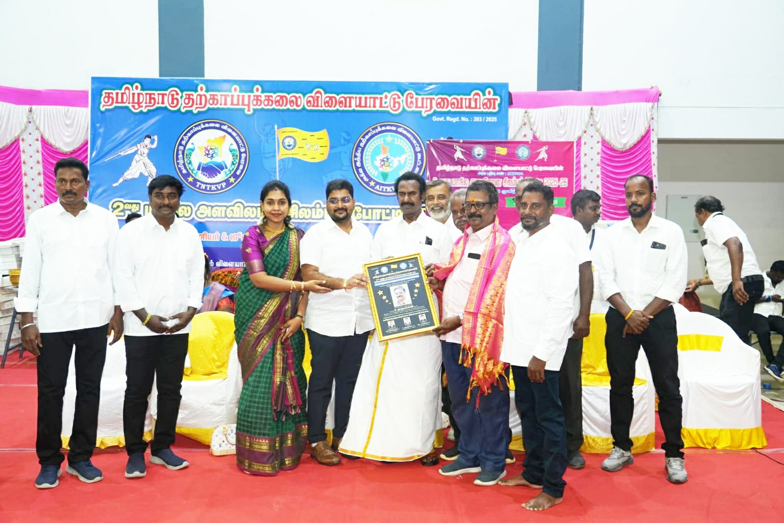 தமிழ்நாடு தற்காப்பு கலை விளையாட்டு பேரவை சார்பில் மாநிலஅளவிலான சிலம்ப போட்டி சென்னை அருகே உள்ள மேலக்கோட்டையூர் கண்டிகையில் செயல்படும் தமிழ்நாடு உடற்கல்வியியல் மற்றும் விளையாட்டு பல்கலைக்கழக வளாகத்தில் நடந்தது.உலக சிலம்ப ஆசான்கள் மற்றும் ஆசிரியர்கள் ஒருங்கிணைந்த சங்கத் தலைவர். என். ஆர். தனபாலன் போட்டியை தொடங்கி வைத்தார்.மேலும் மூத்த ஆசான்கள் முருககனி, சிவபிரகாசத்திற்கு பேரவை சார்பில் வாழ்நாள் சாதனையாளர் விருதை வழங்கினார்.அருகில் கலைமுதுமணி. ஆர். முருககனி பேரவை நிர்வாகிகள் கஜேந்திரன், நந்தகுமார், சரவணன் உள்ளனர்.