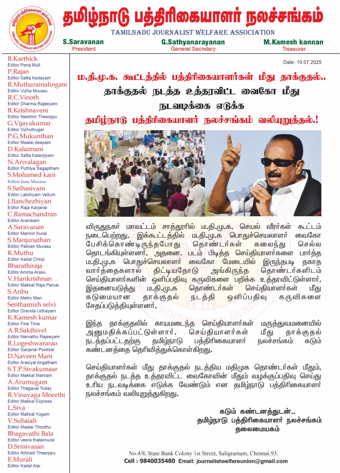 விருதுநகர் மாவட்டம் சாத்தூரில் ம.தி.மு.க. செயல் வீரர்கள் கூட்டம் நடைபெற்றது. இக்கூட்டத்தில் ம.தி.மு.க பொதுச்செயலாளர் வைகோ பேசிக்கொண்டிருந்தபோது தொண்டர்கள் கலைந்து செல்ல தொடங்கியுள்ளனர். அதனை, படம் பிடித்த செய்தியாளர்களை பார்த்த ம.தி.மு.க பொதுச்செயலாளர் வைகோ மேடையில் இருந்தபடி தகாத வார்த்தைகளால் திட்டியதோடு அங்கிருந்த தொண்டர்களிடம் செய்தியாளர்களின் ஒளிப்பதிவு கருவிகளை பறிக்க உத்தரவிட்டுள்ளார். இதனையடுத்து ம.தி.மு.க தொண்டர்கள் செய்தியாளர்கள் மீது கடுமையான தாக்குதல் நடத்தி ஒளிப்பதிவு கருவிகளை சேதப்படுத்தியுள்ளனர்.இந்த தாக்குதலில் காயமடைந்த செய்தியாளர்கள் மருத்துவமனையில் அனுமதிக்கப்பட்டுள்ளார். செய்தியாளர்கள் மீது தாக்குதல் நடத்தப்பட்டதற்கு தமிழ்நாடு பத்திரிகையாளர் நலச்சங்கம் கடும் கண்டனத்தைதெரிவித்துக்கொள்கிறது.செய்தியாளர்கள் மீது தாக்குதல் நடத்திய மதிமுக தொண்டர்கள் மீதும், தாக்குதல் நடத்த உத்தரவிட்ட வைகோவின் மீதும் வழக்குப்பதிவு செய்து உரிய நடவடிக்கை எடுக்க வேண்டும் என தமிழ்நாடு பத்திரிகையாளர் நலச்சங்கம் வலியுறுத்துகிறது.எஸ்.சரவணன்