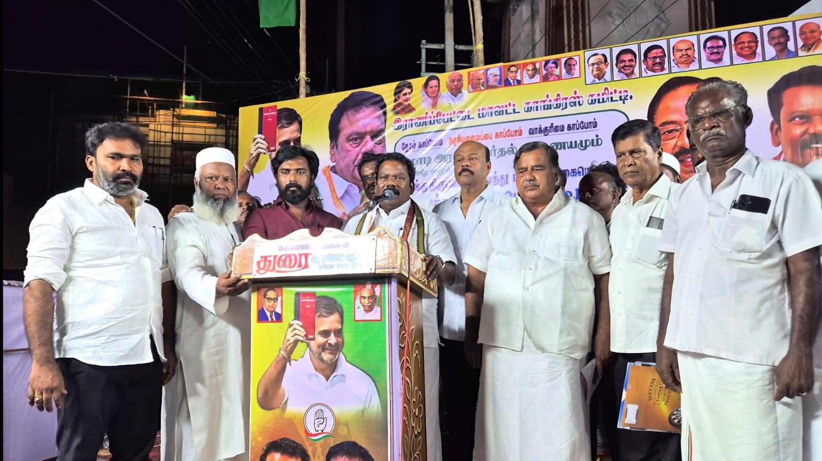 ராணிப்பேட்டை மாவட்டம் ஆற்காடு பேருந்து நிலையம் காந்தி சிலை அருகில் ஆற்காடு சட்டமன்றத் தொகுதி சார்பில் இந்திய தேர்தல் ஆணையமும் மத்திய பிஜேபி அரசும் இணைந்து நடத்தும் வாக்கு திருட்டை கண்டித்து மாபெரும் விளக்க பொதுக்கூட்டம் மாவட்டத் தலைவர்பஞ்சாட்சரம் அவர்கள் தலைமையில் நடைபெற்றது. இந்த நிகழ்ச்சியில் மாநிலத் தலைவர் செல்வ பெருந்தகை திருட்டு ஓட்டை கண்டித்து பொது மக்களிடம் கையெழுத்து பெரும் நிகழ்வை தொடங்கி வைத்து தனது கையொப்பத்தை பதிவிட்டார் தொடர்ந்து பாஜகவின் தேர்தல் தில்லு முலுகலை கண்டித்து கண்டன உரையாற்றினார்..தமிழ்நாடு காங்கிரஸ் கமிட்டி துணை தலைவரும் கிராம காங்கிரஸ் கமிட்டி கோட்டம்-3 மண்டல ஒருங்கிணைப்பாளர் குலாம் மெய்தின் மாநில பொதுச் செயலாளர் ராஜ்குமார் மாவட்ட செய்தி தொடர்பாளர் அட்வகேட் அண்ணாதுரை ஆகியோர் சிறப்புரையாற்றினார்கள் ஆற்காடு நகரத்தலைவர் பியாரேஜான் அனைவரையும் வரவேற்றனர் மாவட்ட துணைத் தலைவர் ஜி விநாயகம் மாவட்ட பொதுச் செயலாளர் வேலூர் நந்தகுமார் மேச்சேரி பன்னீர்செல்வம் சிறுபான்மை துறை மாவட்ட தலைவர்நிஷாத் அஹமத் மாவட்டச் செயலாளர் தீபன் நிர்மல் ஆகியோர் நிகழ்ச்சியை ஒருங்கிணைத்தார்கள்.