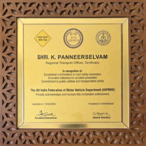 I am delighted to share that the All India Federation of Motor Vehicle Department (AIFMD) has honored me with the Best Road Safety Performer Award for 2025. This recognition is a testament to my dedication to promoting Road Safety.The award ceremony took place on April 12, 2025, in Ahmedabad, Gujarat. I would like to express my heartfelt gratitude to the Transport Department of Tamil Nadu and I am grateful for this acknowledgment and look forward to continuing my efforts in enhancing Road Safety Awareness.